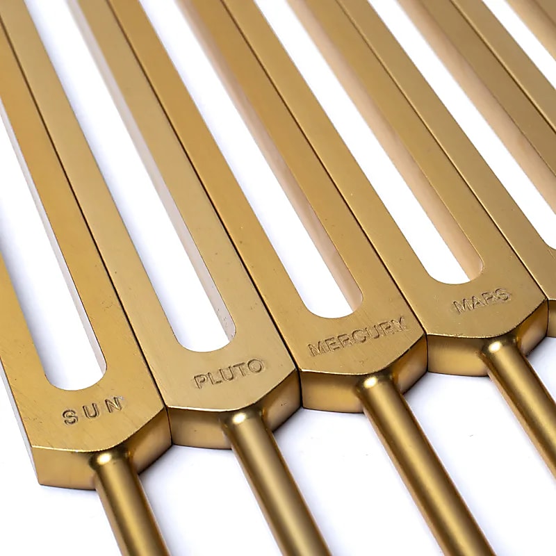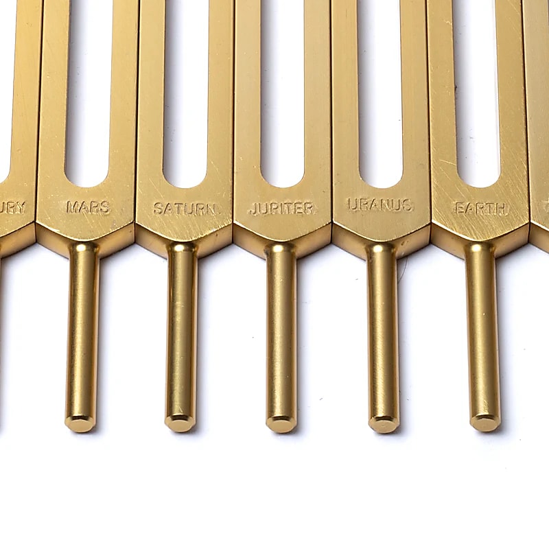 Chaque diapason est accordé selon les fréquences orbitales des planètes du système solaire, du Soleil et de la Lune, traduites en sons audibles pour rééquilibrer le corps, l’âme et l’esprit.